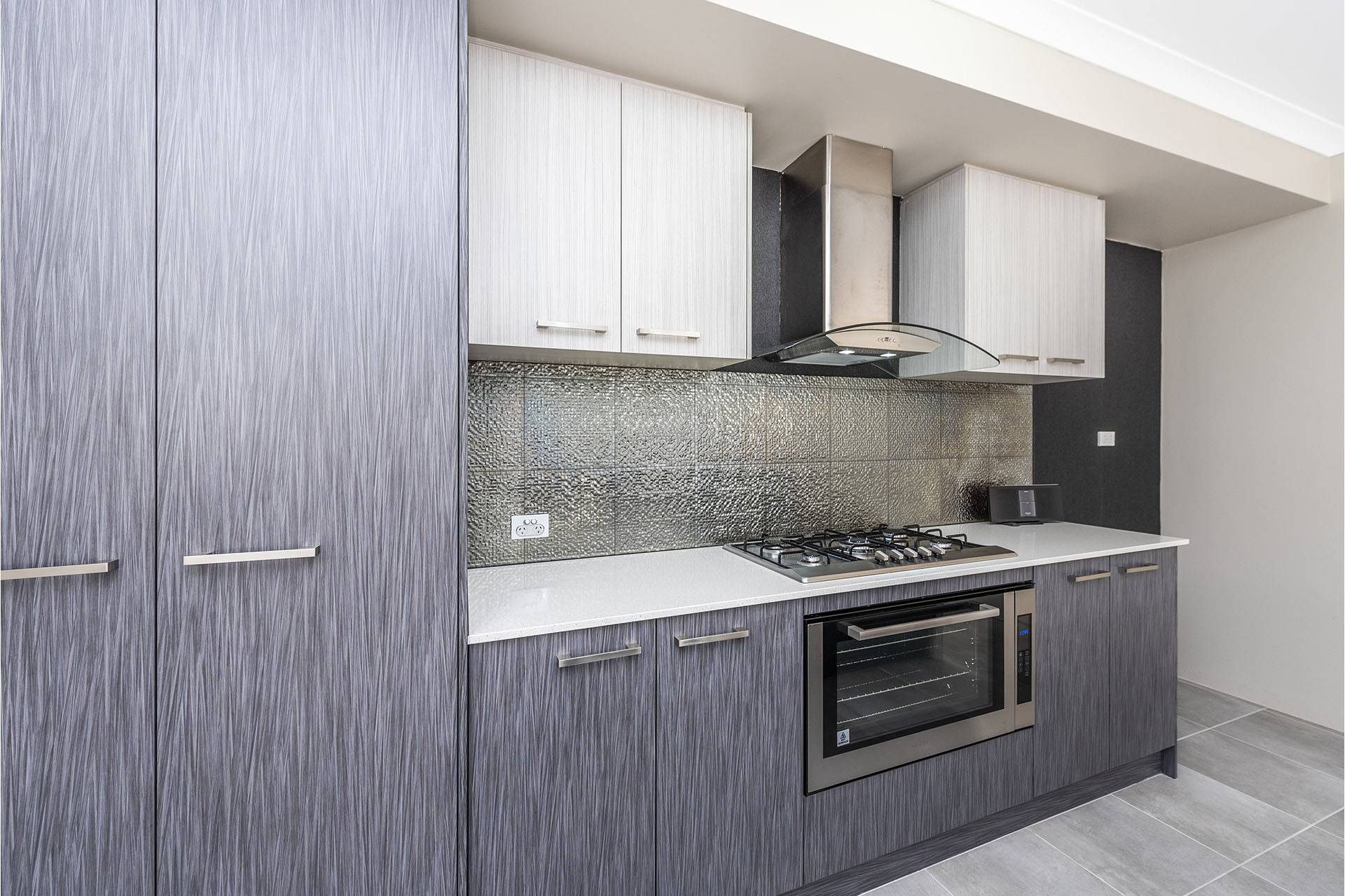 The kitchen featuring high quality, built-in 900mm appliances, beautiful stone benchtops with a breakfast bar and ample of storage cupboards.