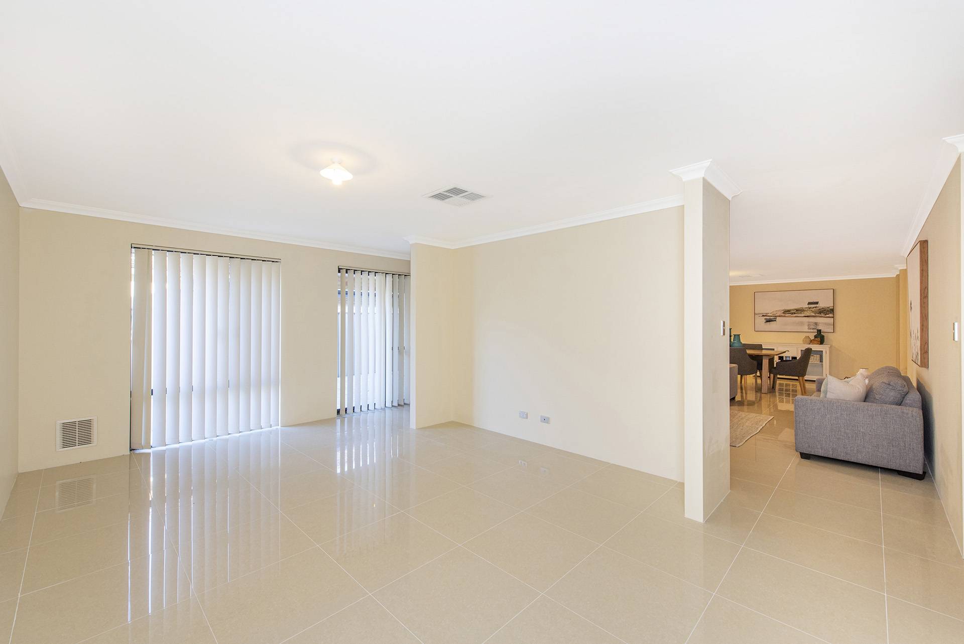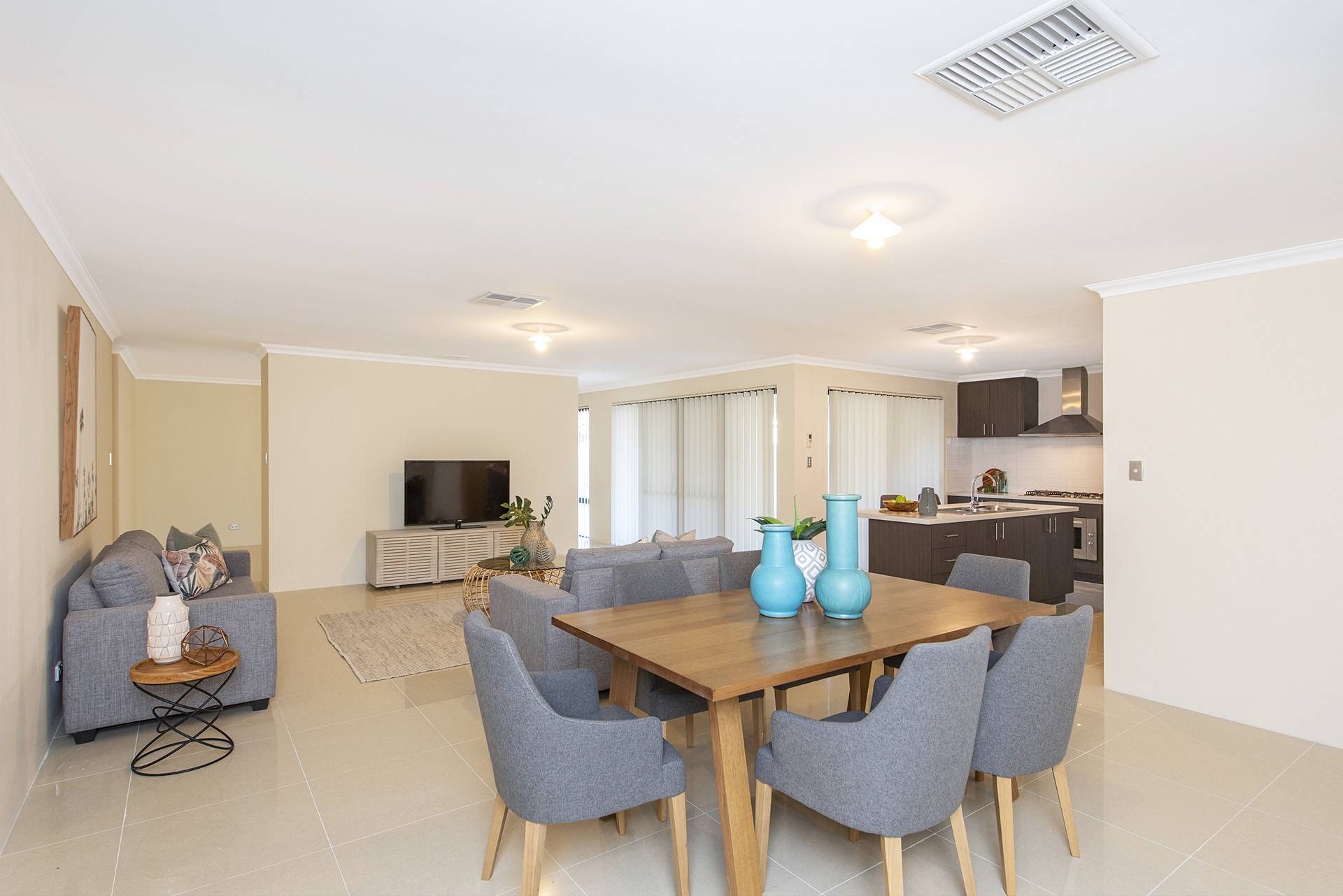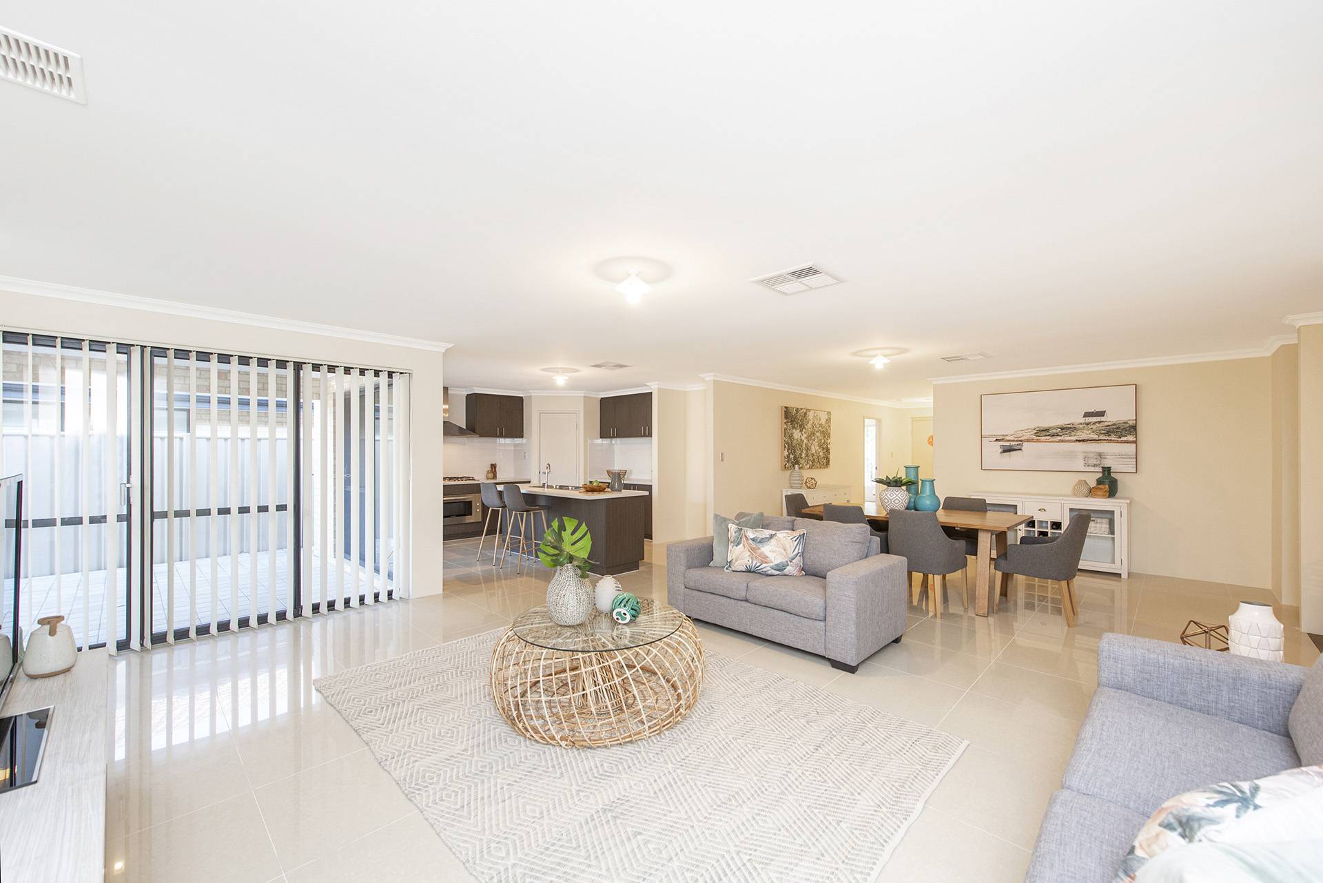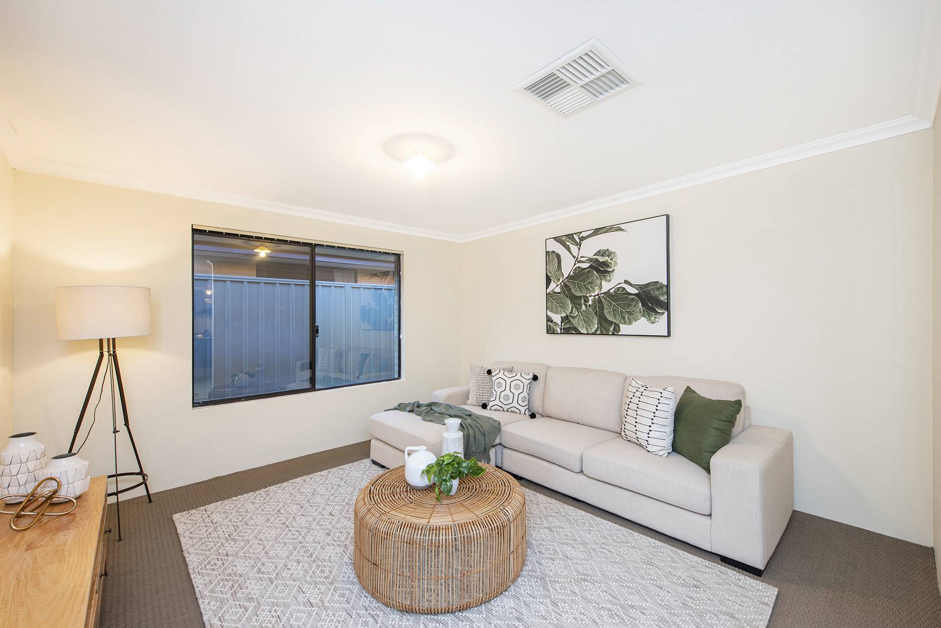 The property features a beautiful open-plan living, dining, and kitchen area leading to the and secondary rooms and overlooking the backyard, all featuring built-in robes and carpets with ducted air conditioning.