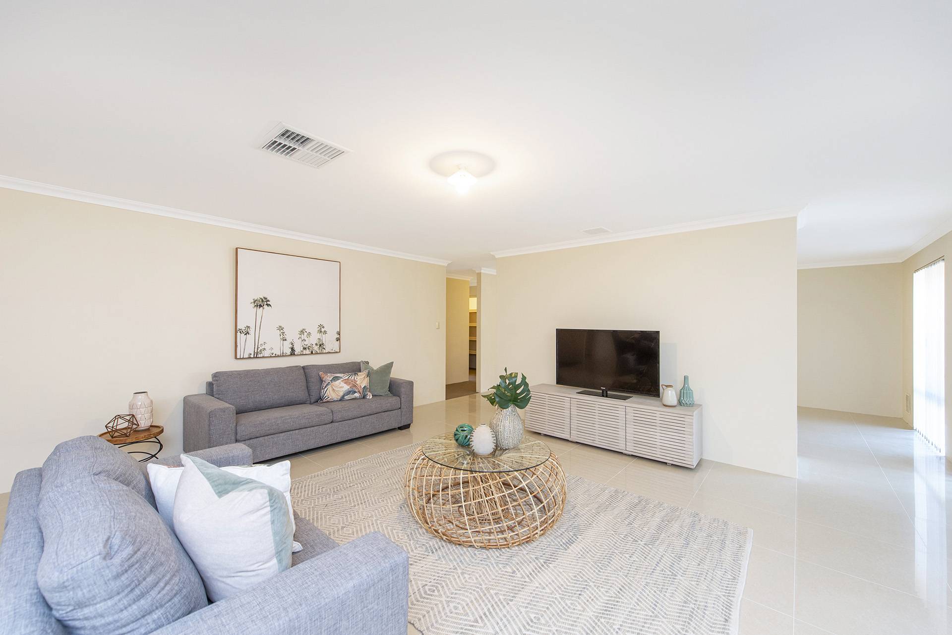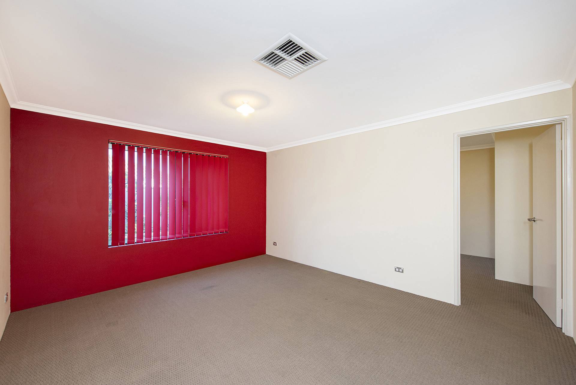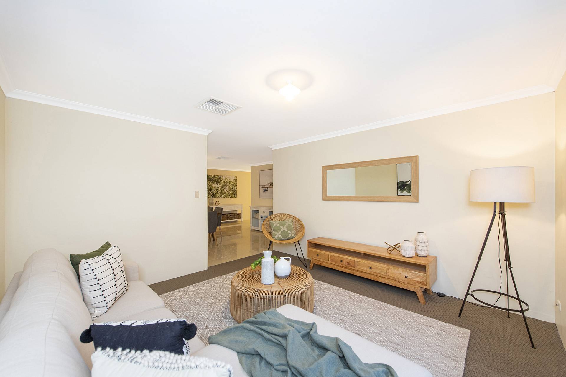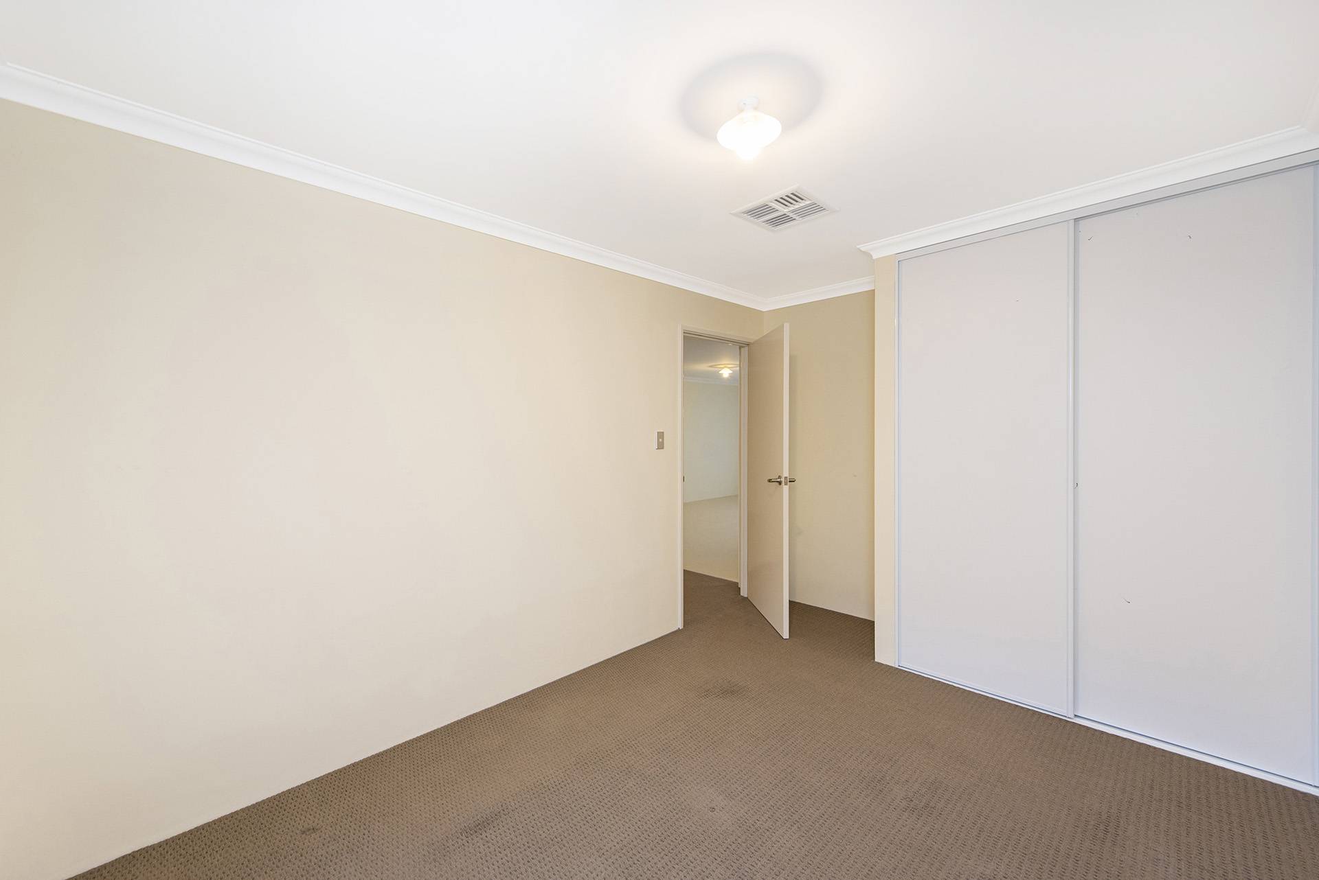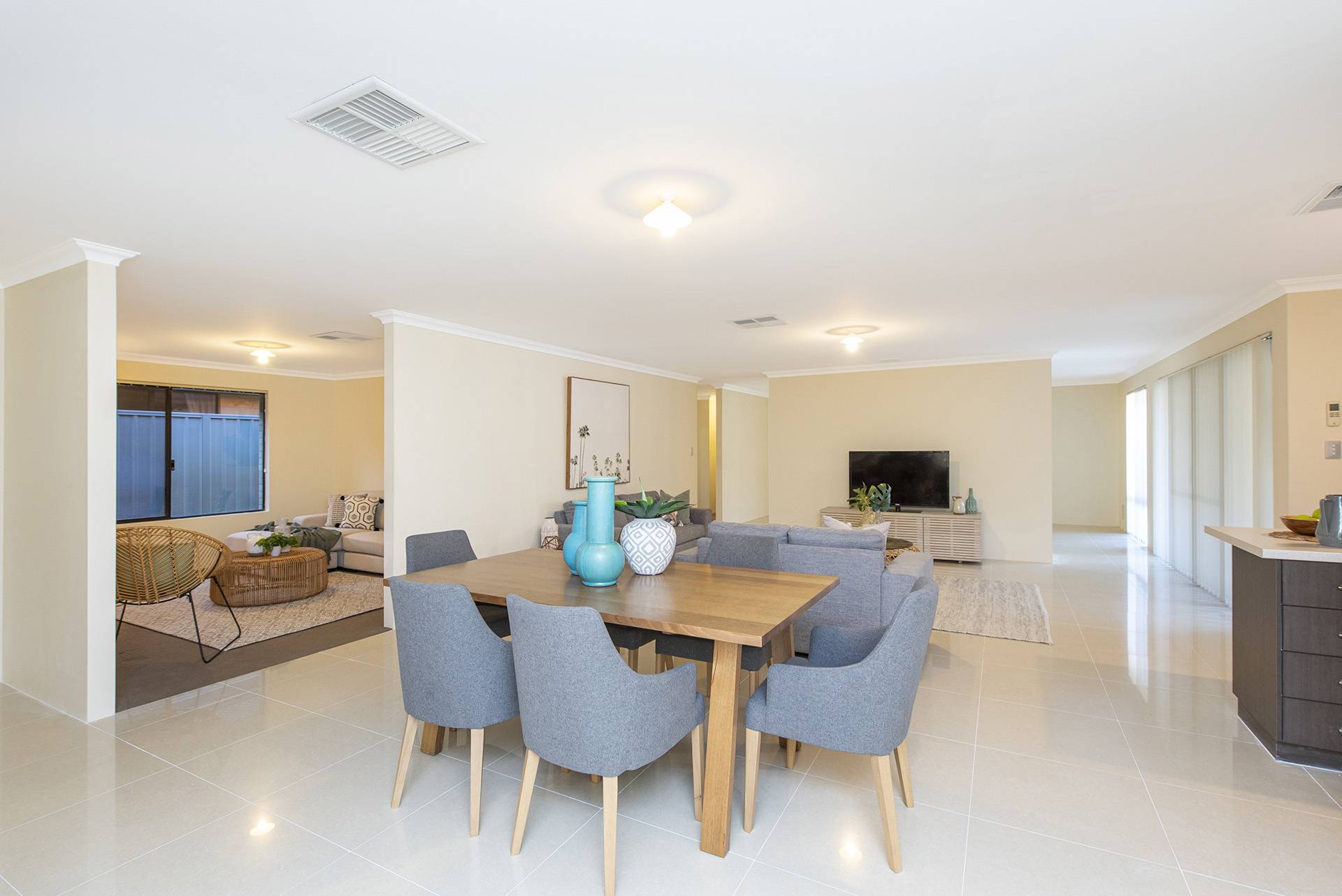 The property features a beautiful open-plan living, dining, and kitchen area leading to the and secondary rooms and overlooking the backyard, all featuring built-in robes and carpets with ducted air conditioning.