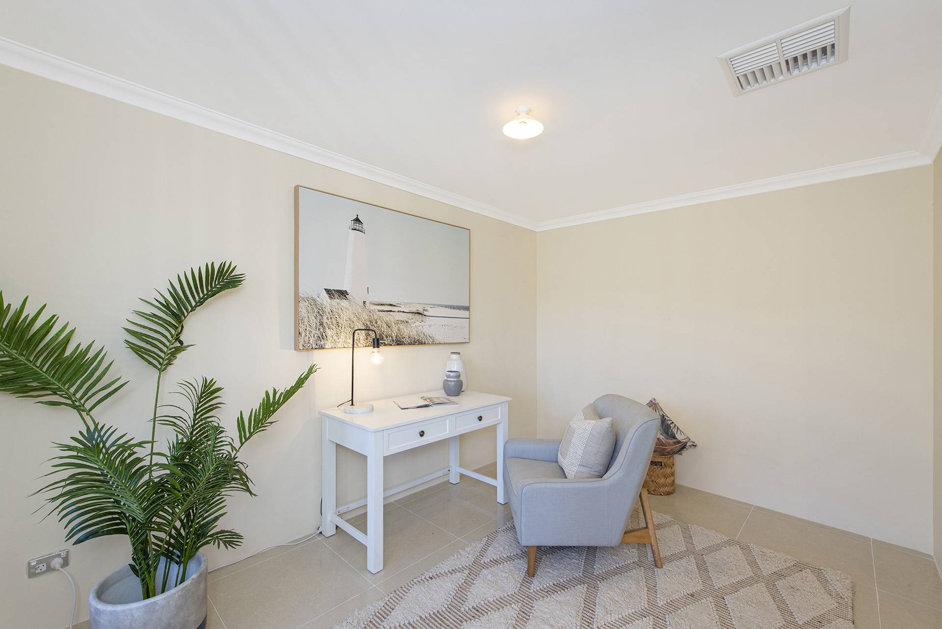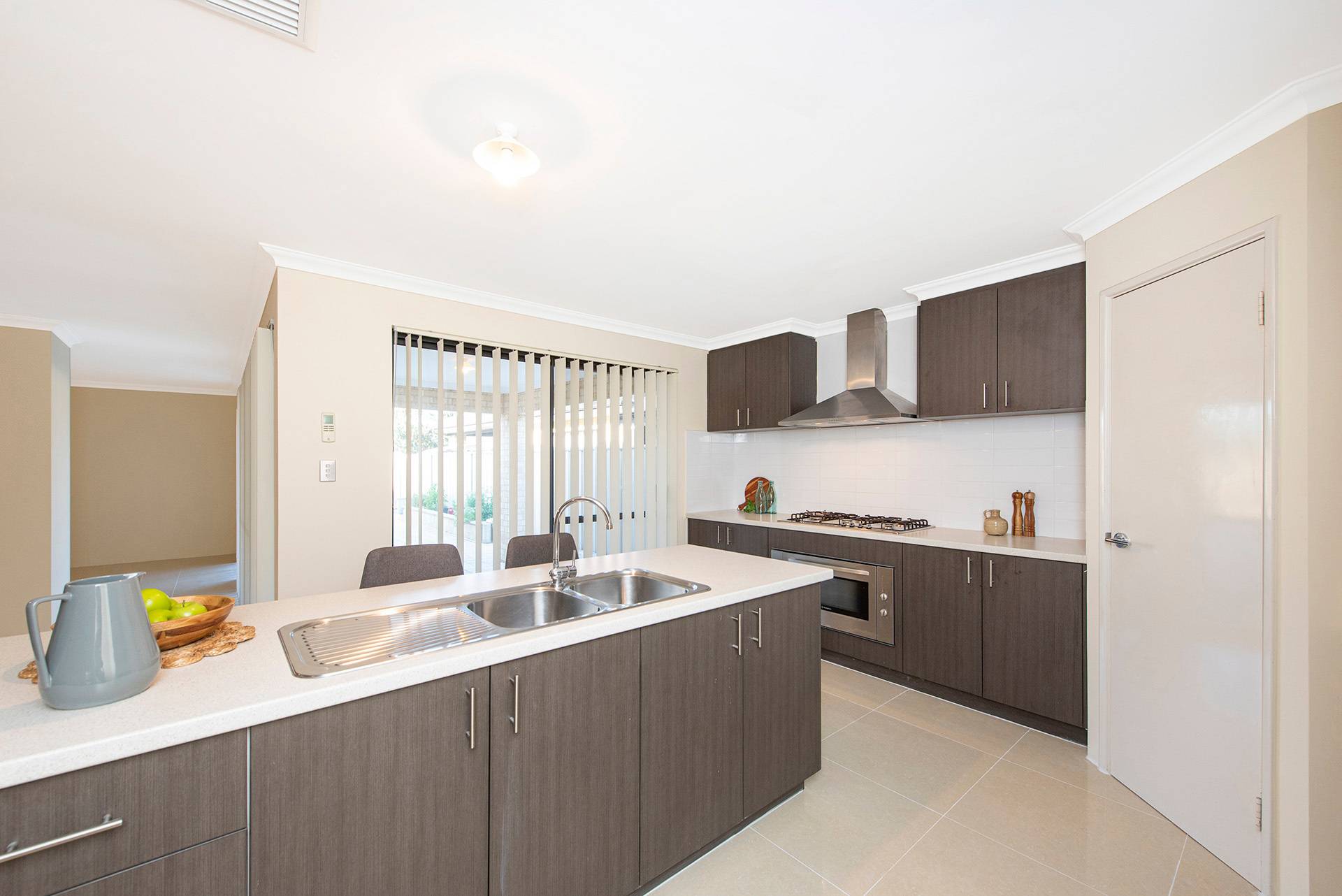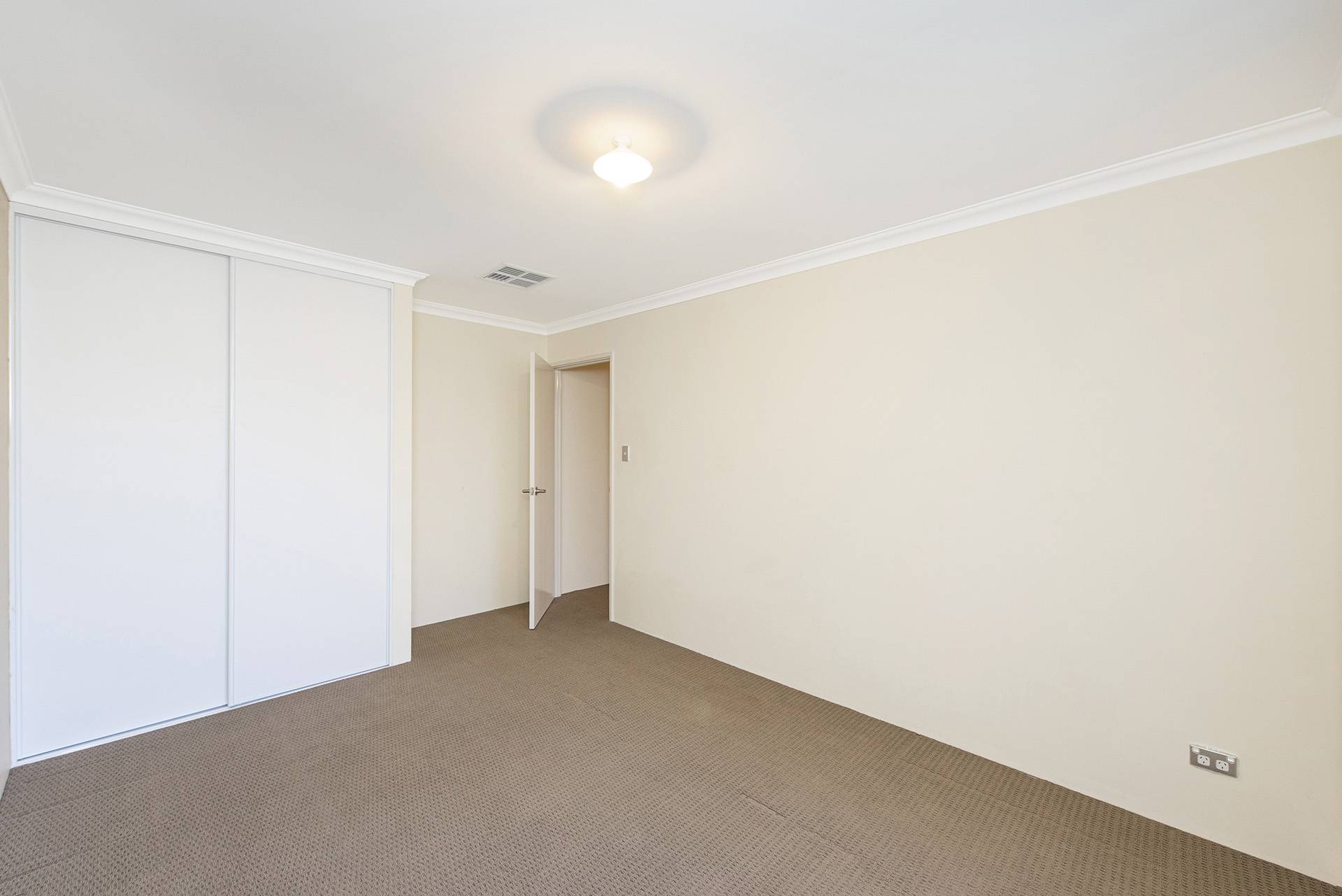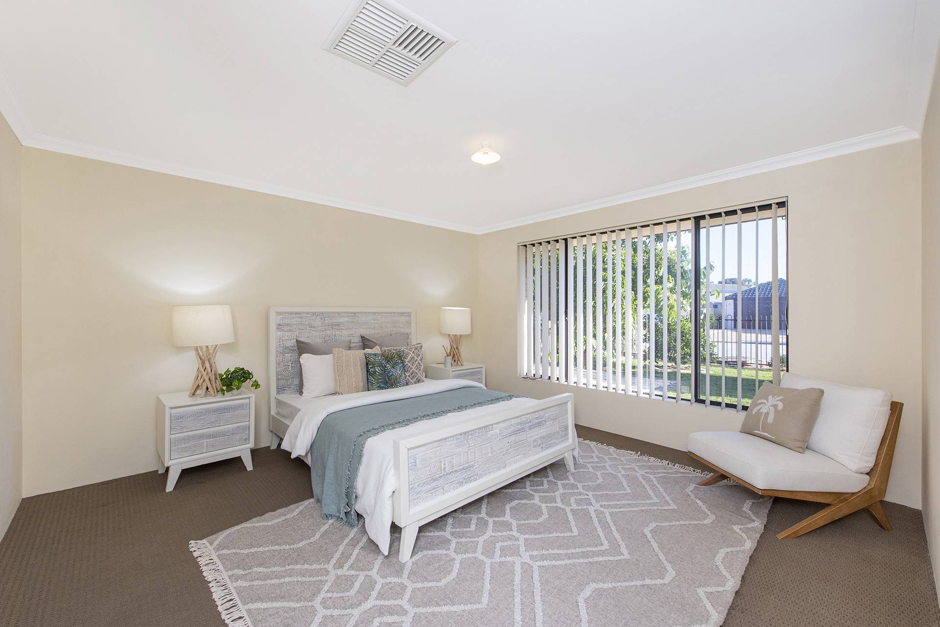 The property features a beautiful open-plan living, dining, and kitchen area leading to the and secondary rooms and overlooking the backyard, all featuring built-in robes and carpets with ducted air conditioning.