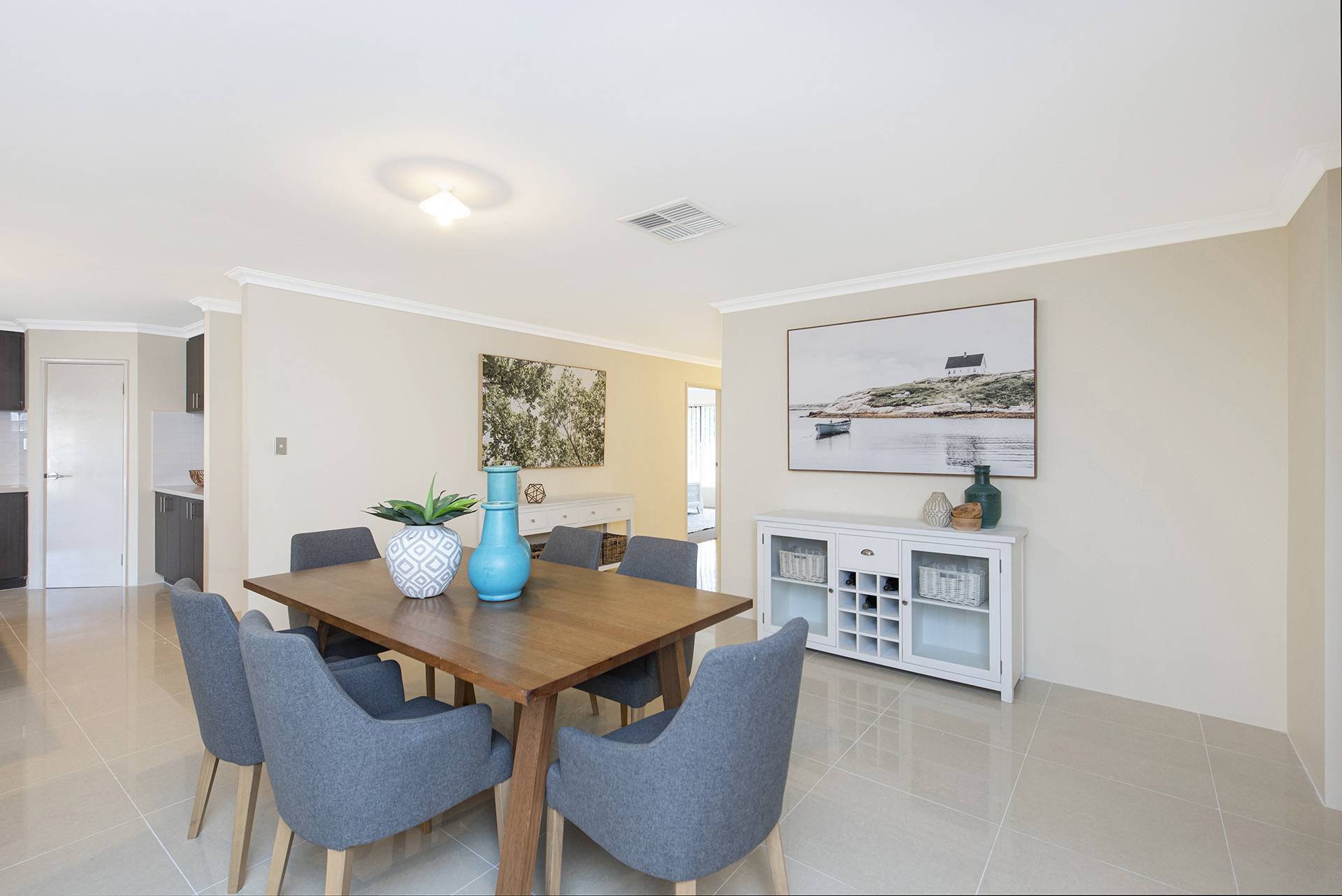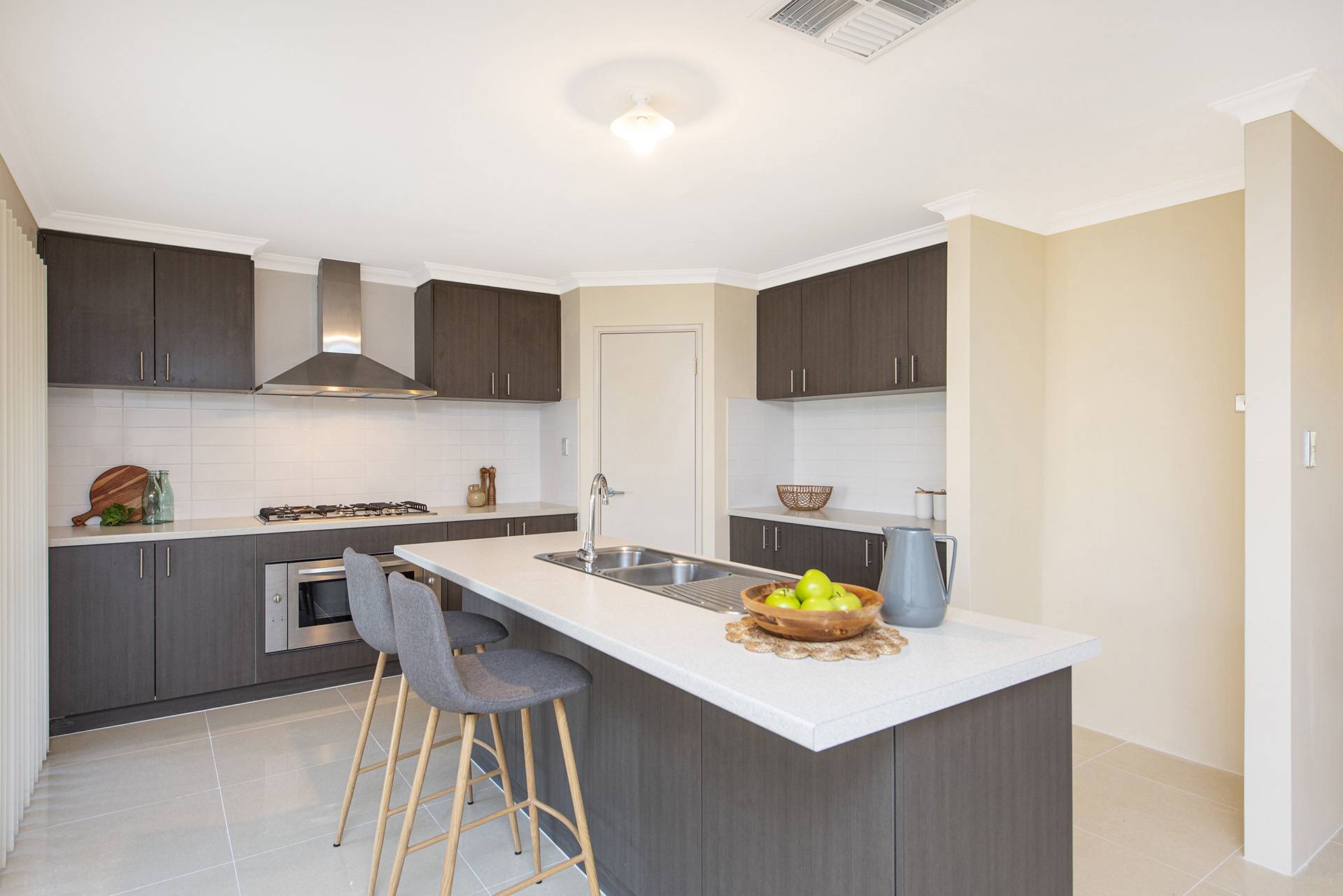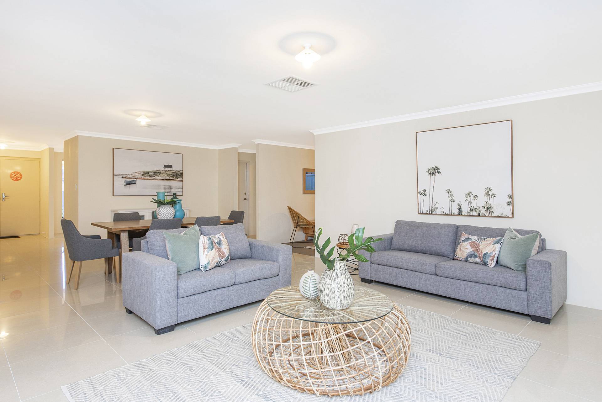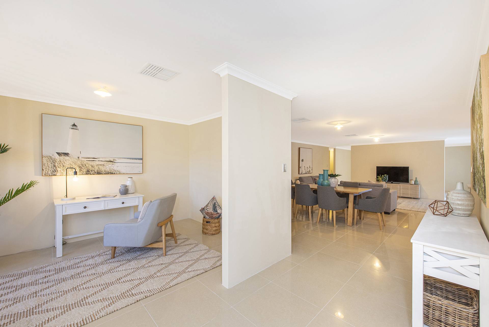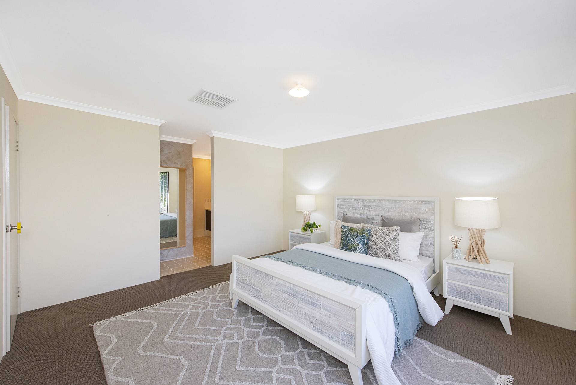 The property features a beautiful open-plan living, dining, and kitchen area leading to the and secondary rooms and overlooking the backyard, all featuring built-in robes and carpets with ducted air conditioning.