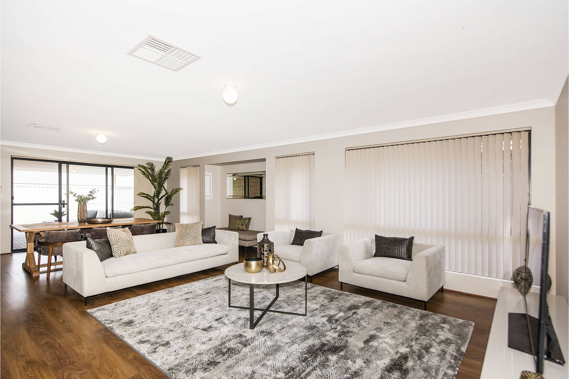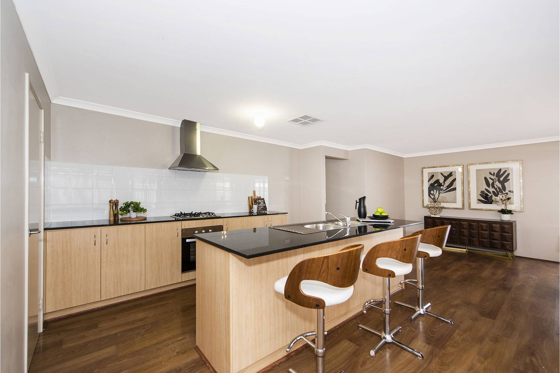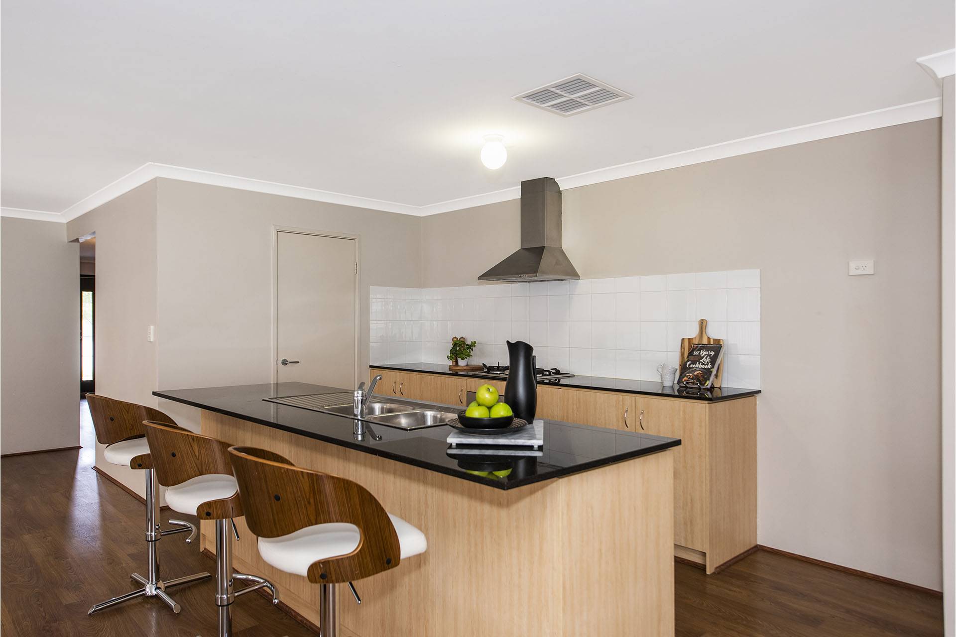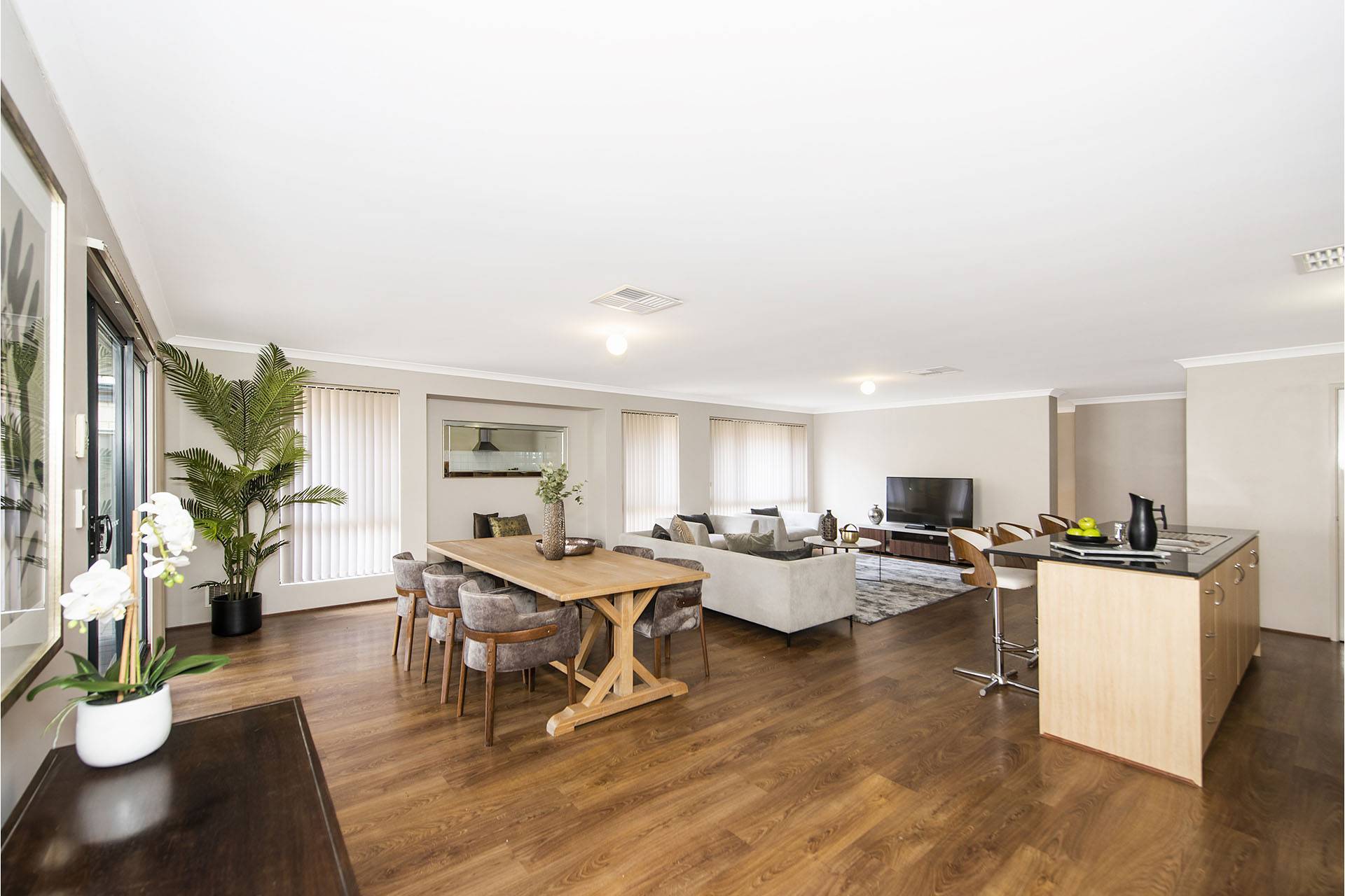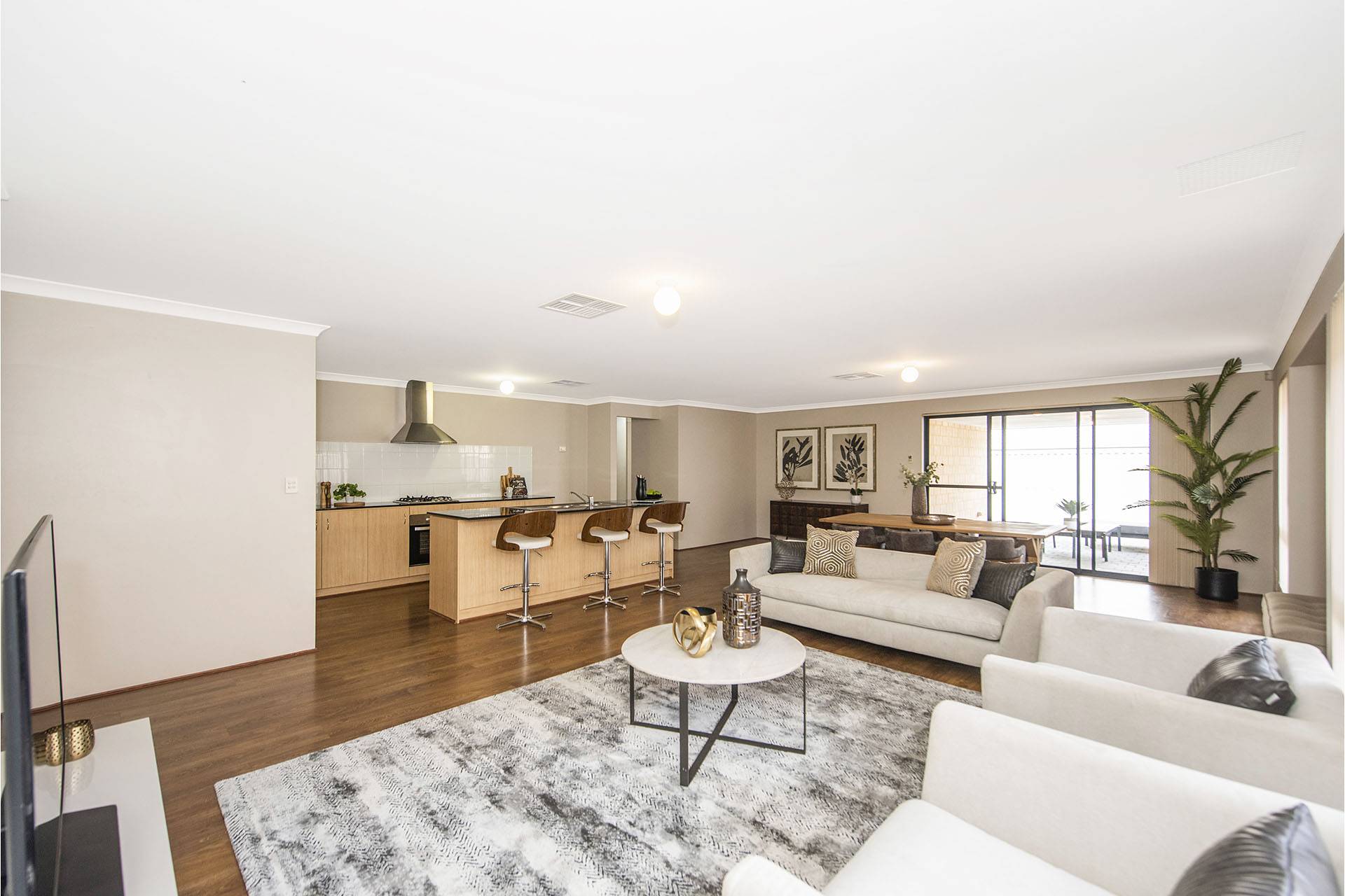 This home features beautiful stone benchtops with a huge open-plan living, kitchen, and dining area looking out to the alfresco.
