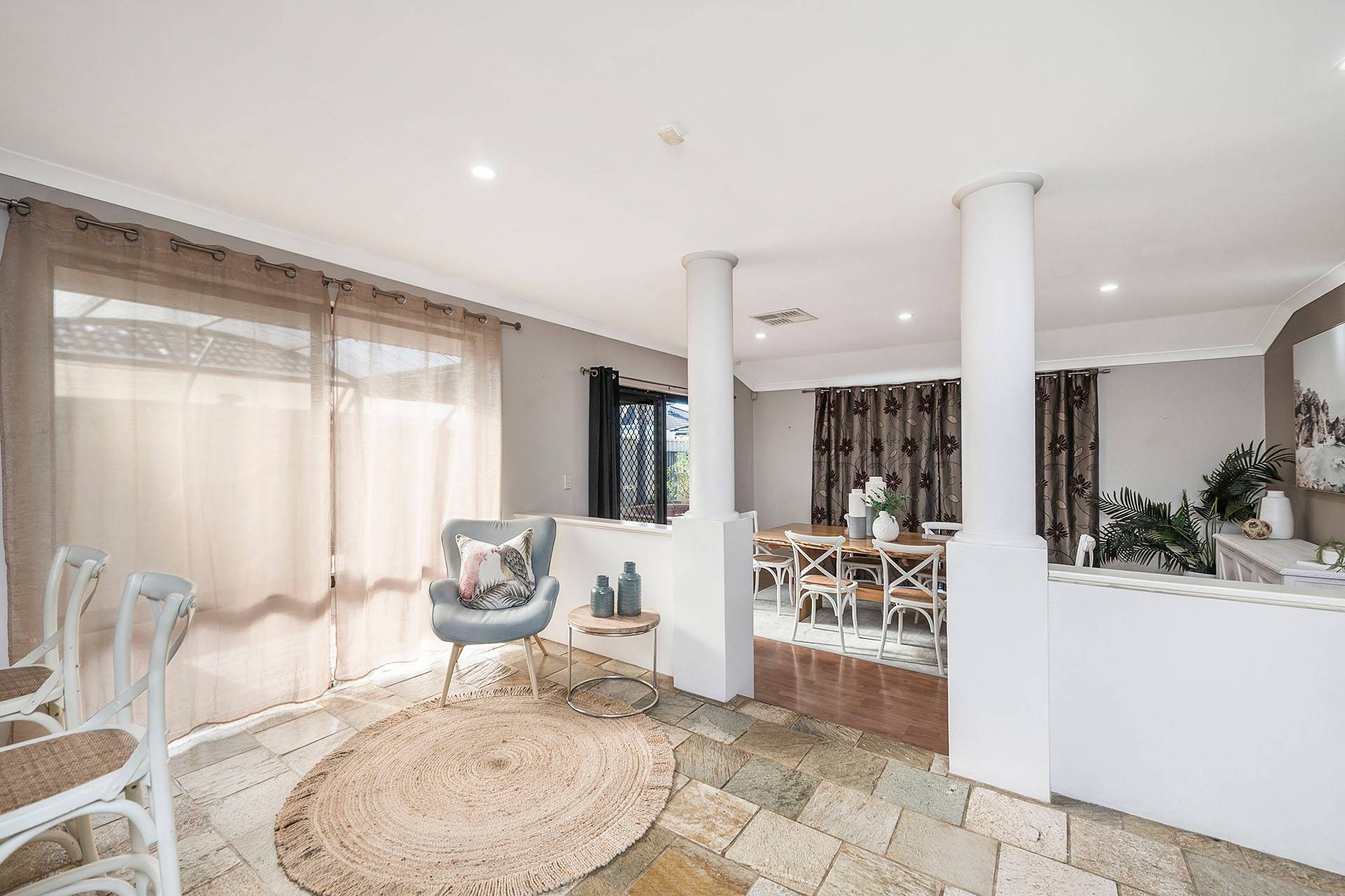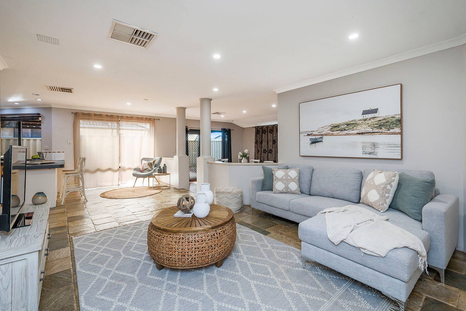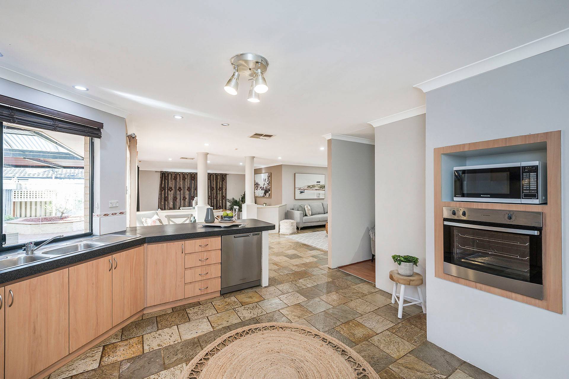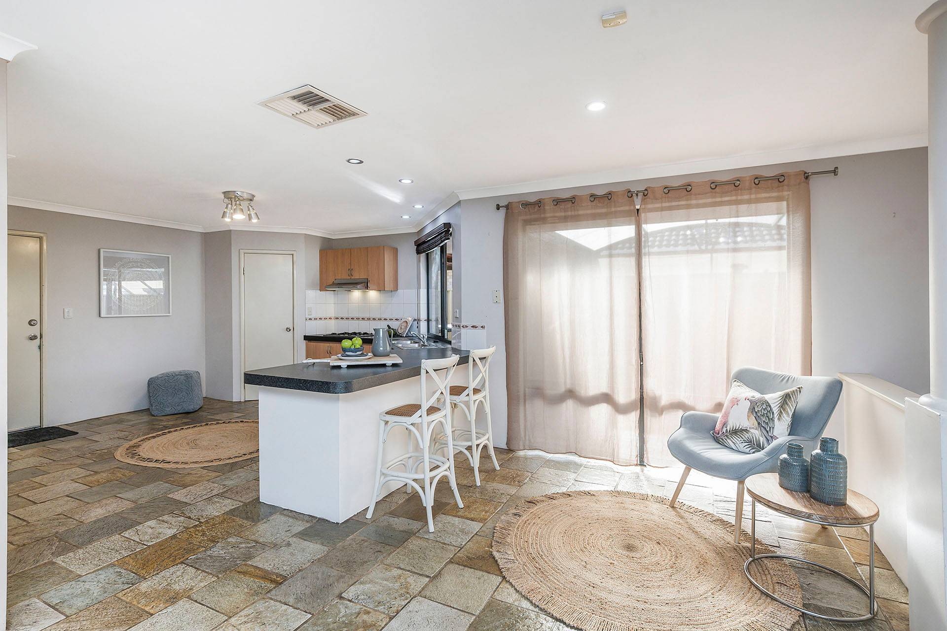 - Open kitchen/living/dining areas